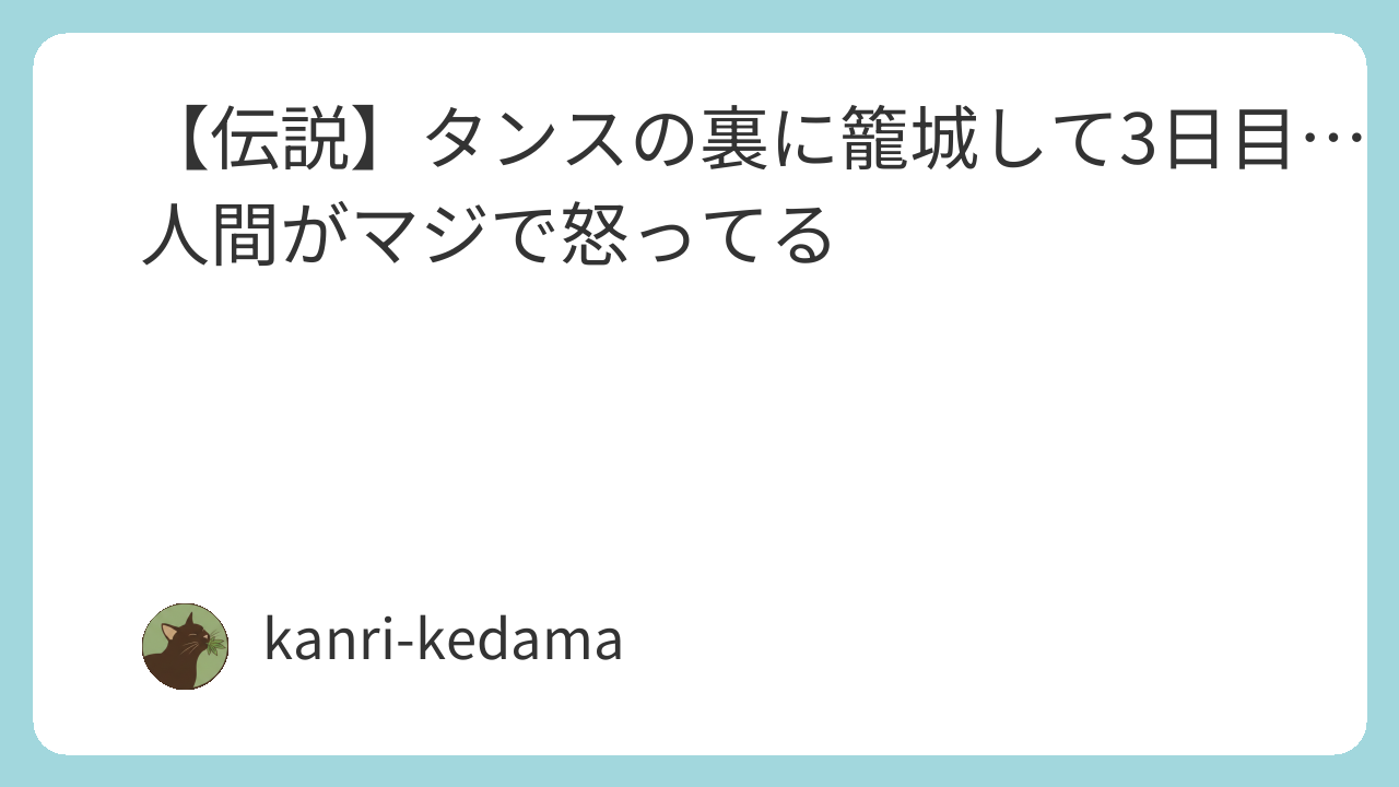 【伝説】タンスの裏に籠城して3日目…人間がマジで怒ってる