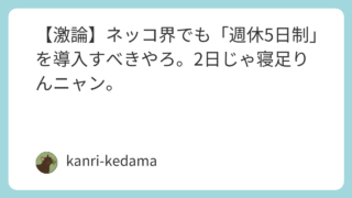 未分類 【激論】ネッコ界でも「週休5日制」を導入すべきやろ。2日じゃ寝足りんニャン。
